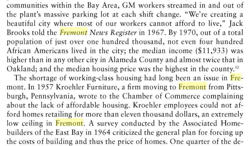 Fremont was created almost explicitly as an anti-Oakland, born out of GM's deurbanization policy and 1964 move of and huge expansion of factory there from Oakland, and a settler homeowner class eager to create white affluent homeowner utopia, Self's "American Babylon" depicts.pic.twitter.com/fMYXe8HMtu