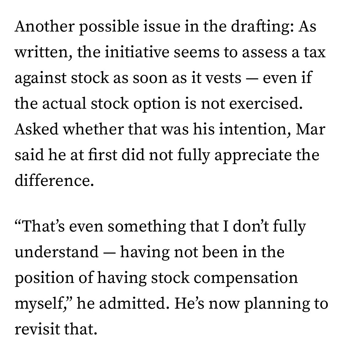 Everyone remember that @D4GordonMar floated a profoundly ill-thought out plan to tax all stock-based compensation in SF and still wants to bring it back to the ballot next year. https://www.vox.com/recode/2019/5/15/18618727/silicon-valley-san-francisco-ipo-tax …https://twitter.com/chanian/status/1185266029351464960 …