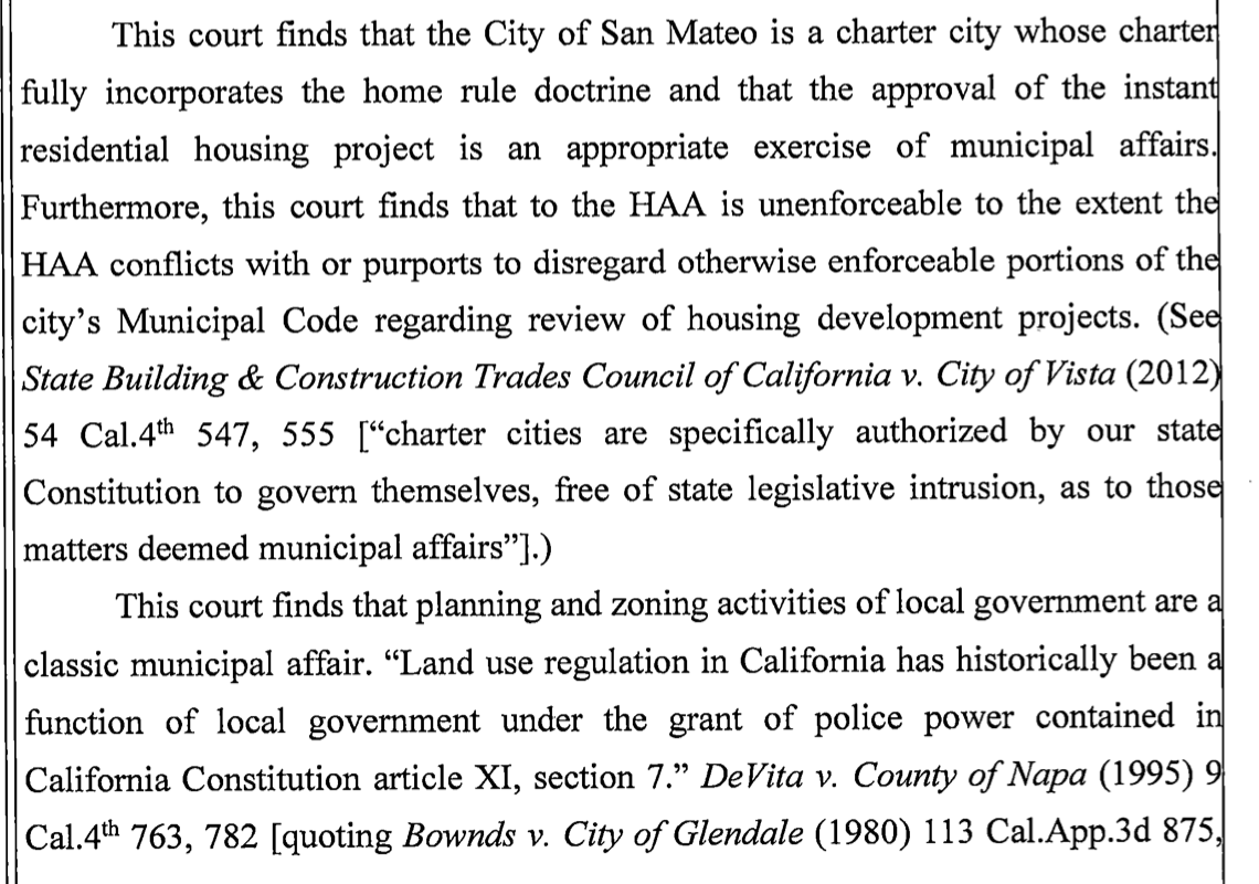 Here’s the full opinion saying that the Housing Accountability Act is unenforceable against charter cities, per requests. It was issued earlier this month in a case against the city of San Mateo filed by SF BARF. http://twitdoc.com/AP19