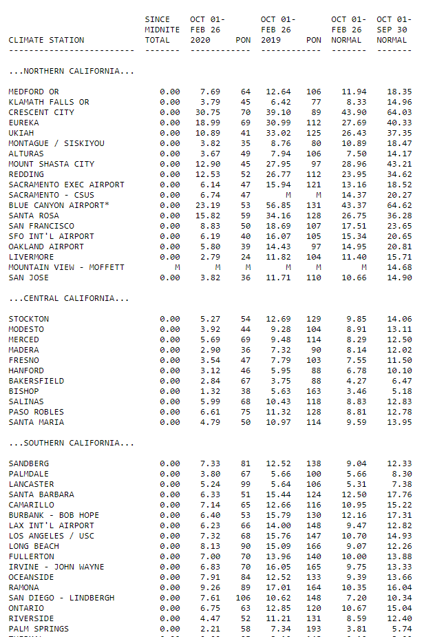 For now expanding drought in Winter is more of a fire season proxy vs. a true drought (at least so far). Note: major reservoirs in decent shape. While Spring rain might not fully recover deficits, hopefully it can delay an early fire (& power off) season. #CAwxpic.twitter.com/rJrpfq1bvN