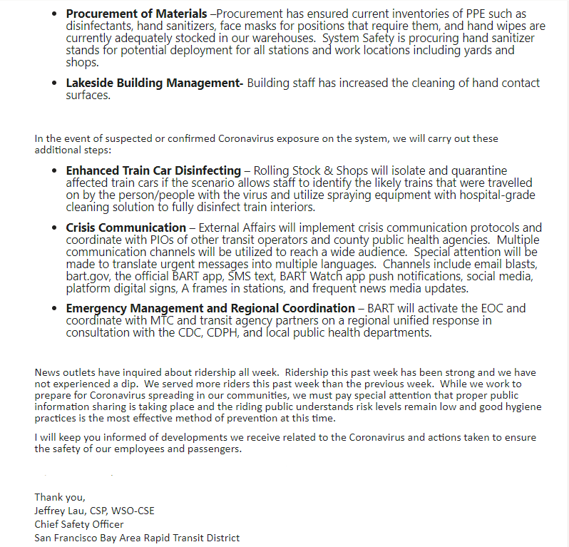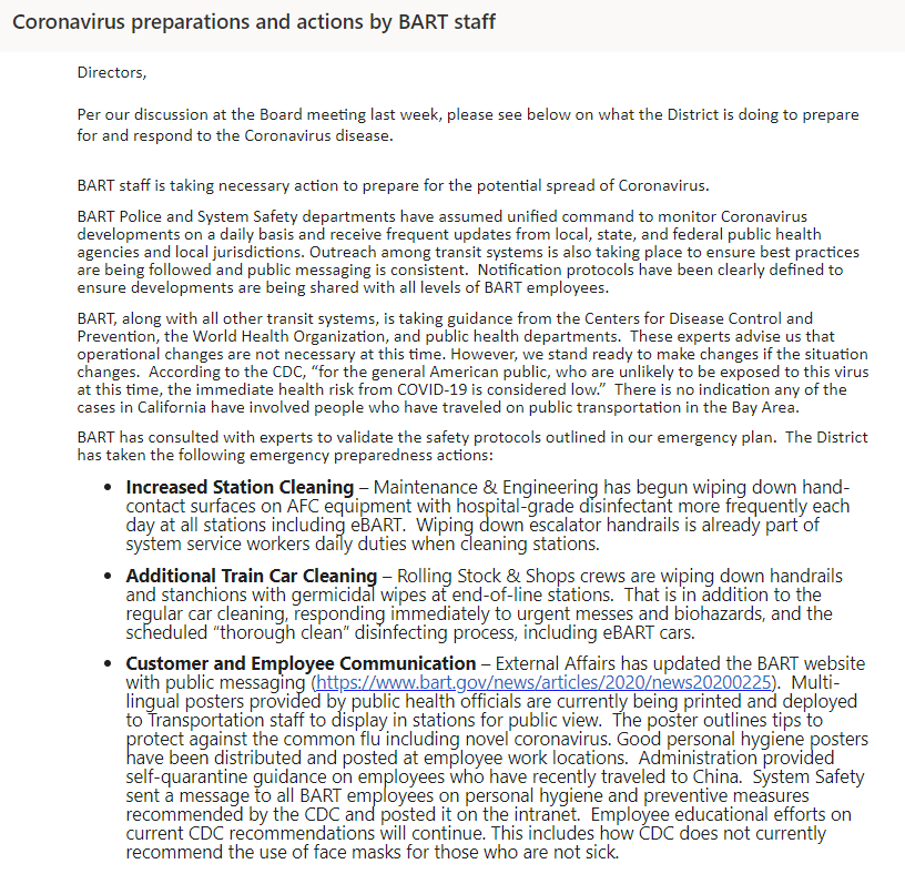 Since folks have been asking me about BART's coronavirus plans, I asked staff for a memo. Here's the memo BART's chief safety officer sent to the BART Board Monday evening. It includes what BART is doing now, and what BART would do if there's coronavirus exposure on BART. pic.twitter.com/KhwzyazUOS