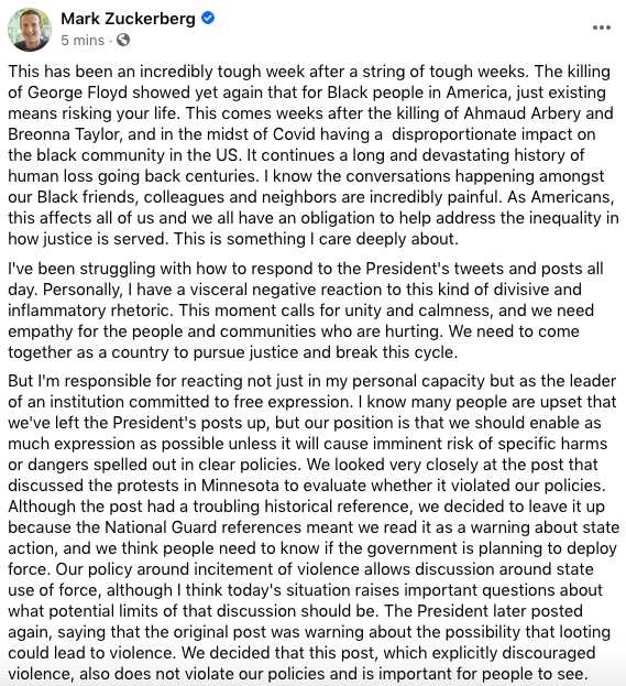 New Mark Zuckerberg post on Trump: "Personally, I have a visceral negative reaction to this kind of divisive and inflammatory rhetoric." "But I'm responsible for reacting not just in my personal capacity but as the leader of an institution committed to free expression."pic.twitter.com/q2WVgrgZ3m