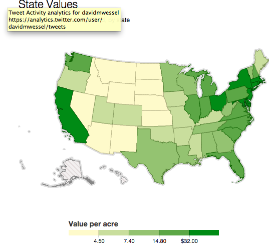 Average value of land per acre in the lower 48 by state via Bureau of Economic Analysis http://on.wsj.com/1DA6A0A pic.twitter.com/tlH5vEIXgv
