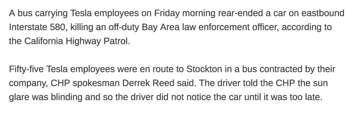 An off-duty police officer was killed in a collision with a private tech shuttle for Tesla workers from Stockton...? http://www.nbcbayarea.com/news/local/Sig-Alert-Issued-After-Tour-Bus-and-Sedan-Collide-on-I-580-in-Alameda-County-422100673.html?_osource=SocialFlowTwt_BAYBrand …pic.twitter.com/V1Caxgeh1d