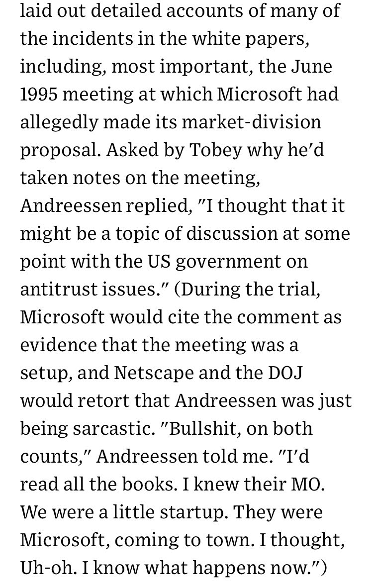 Talk to Marc about the role an assertive govt agency can playhttp://www.zdnet.com/article/netscape-imagined-antitrust-case-microsoft-charges/ …