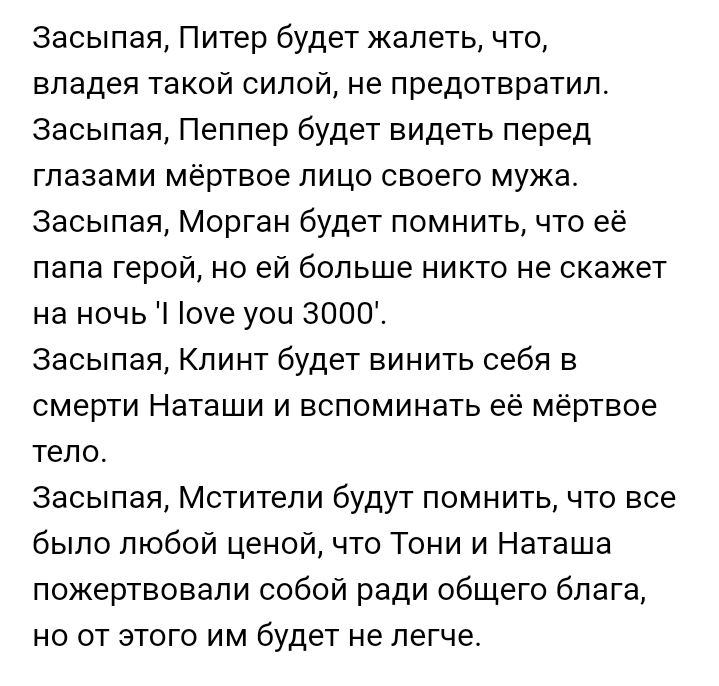Хочу скинуть Тайке деньги на карту, чтобы он переснял этот проклятый финал. Так я хотя бы точно буду знать, что мстители максимум, что потеряют в бою, это глаз или волосы, а не свою ЖИЗНЬ.