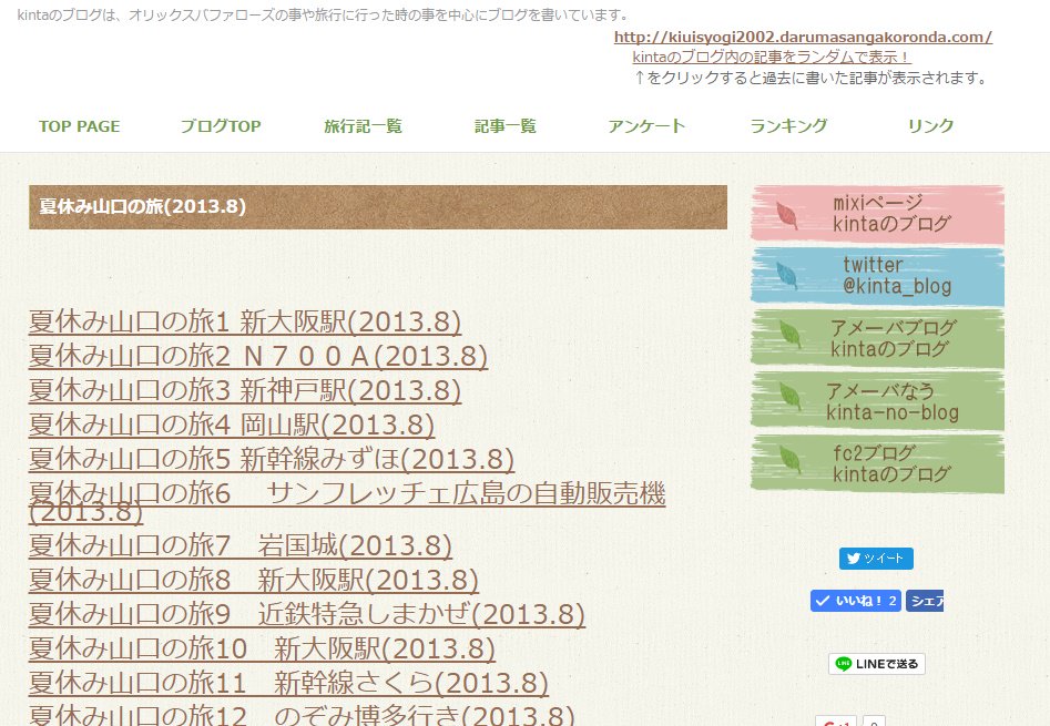 「kintaのブログ ホームページ」 http://kintanoblog.nomaki.jp/index.html オリックスバファローズや旅行記などの記事の一覧などをまとめています。2018年1月現在で3600記事を載せています。