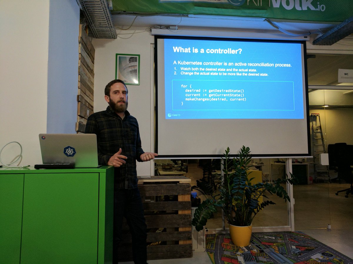 Aaron from CoreOS talking about Operators and custom #Kubernetes controllers at tonight's Berlin meetup. Thanks @kinvolkio for hosting us!pic.twitter.com/6W5MuO0VwW