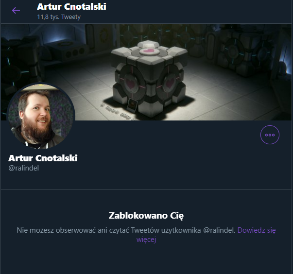 w tzw. miedzyczasie (a na twitterze zbanowana jeszcze 2 godziny temu nie byłam) dostałam od niego bana od tak - nawet mu nic nie komentowałam. Ba! Ja go nawet nie obserwowałam. Splendid.pic.twitter.com/QFRISn3ezn