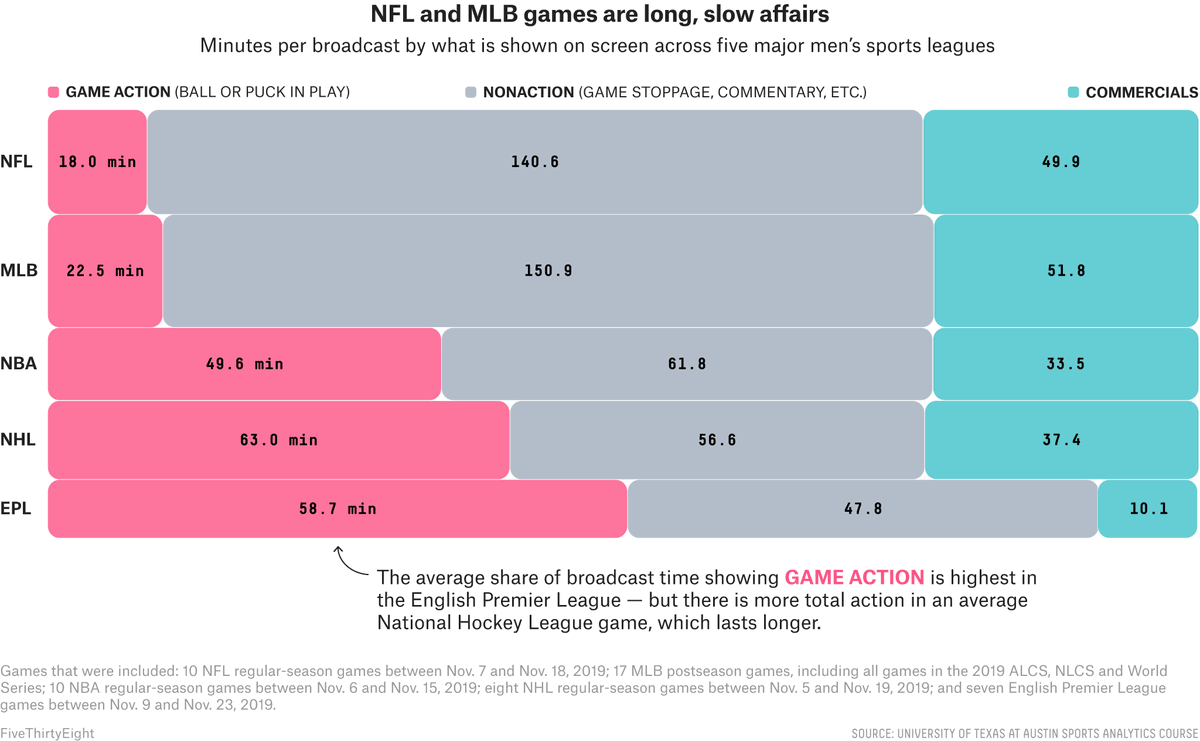 There's not much actual football in a football game. https://fivethirtyeight.com/features/how-much-football-is-even-in-a-football-broadcast/ …pic.twitter.com/QViNfiUCzP