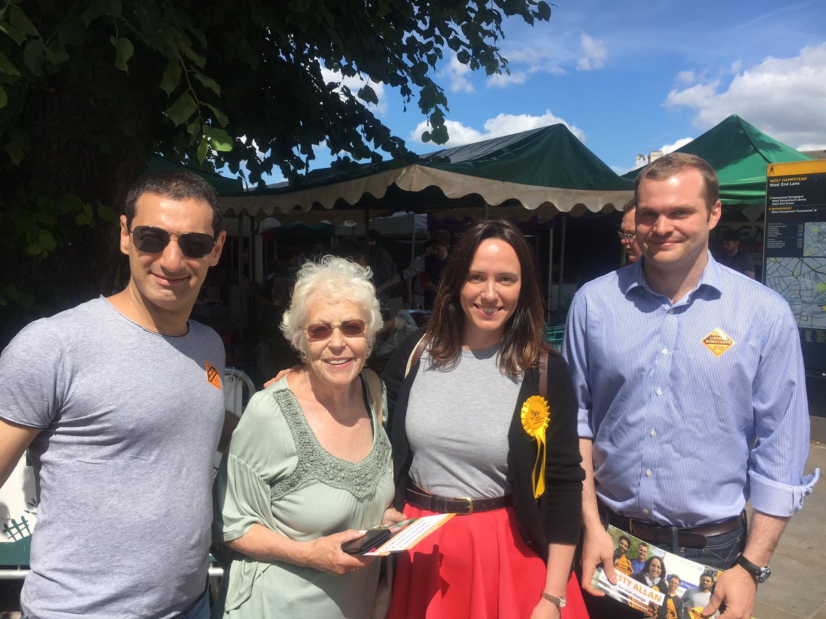 Sunny morning at the #WestHampstead Farmer's Market with local institution @FlickRea. Lots of support for the @CamdenLibDems. #GE2017pic.twitter.com/rAbzKxIa5V