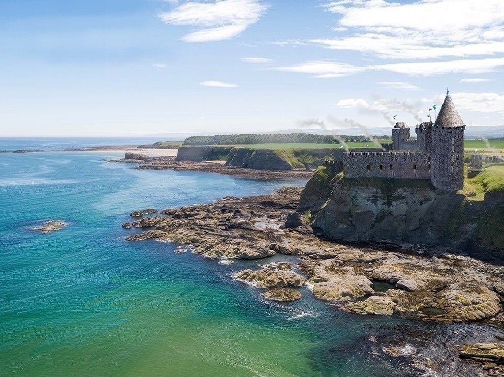 Tantallon Castle cliff with CGI walls as it appeared in Mary Queen of Scots Movie (2019) and overlap of orginal conical roofed Donjon Douglas Tower with rectangular Plan Hall/Kitchen blockhouse suggestion. A Red Dougas family stronghold.