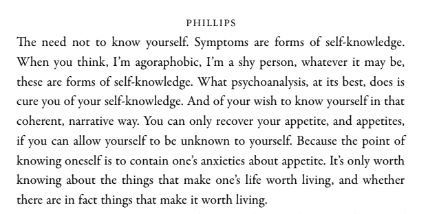 @holdengraber interview w/ Adam Phillips is 0.0 "You can only recover your appetite, & appetites, if you can allow yourself to be unknown to yourself. Because the point of knowing oneself is to contain one’s anxieties about appetite." https://www.theparisreview.org/interviews/6286/adam-phillips-the-art-of-nonfiction-no-7-adam-phillips …pic.twitter.com/CiWt2aKB5l
