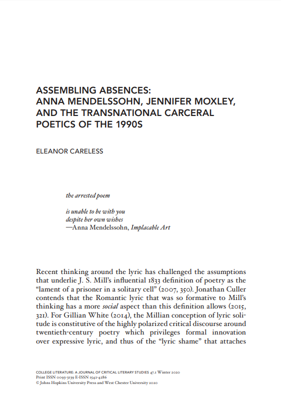 @elcareless) essay, “Assembling Absences: Anna Mendelssohn, Jennifer Moxley, and the Transnational Carceral Poetics of the 1990s” in 47.1, available @ http://muse.jhu.edu/issue/41709 pic.twitter.com/73dIRgvaRu
