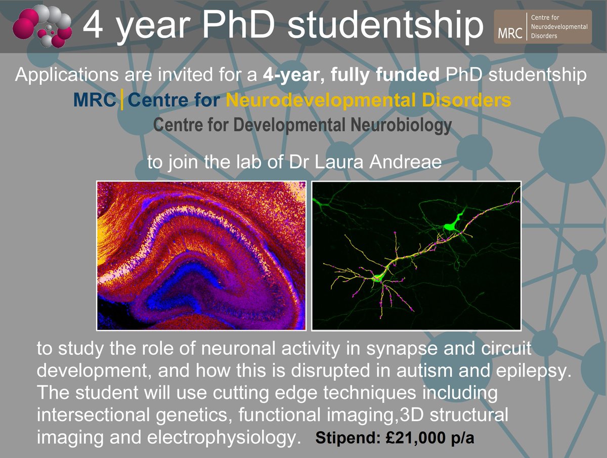 #PhD studentship available in the lab@MRC_CNDD@dev_neuro@KingsIoPPN to research neural activity and circuit development in autism / epilepsy, deadline 7th February 2020! UK/EU eligible. Please RT! https://www.kcl.ac.uk/ioppn/study/research-funding/funded-research-opportunities …pic.twitter.com/ql99Q0xVLH