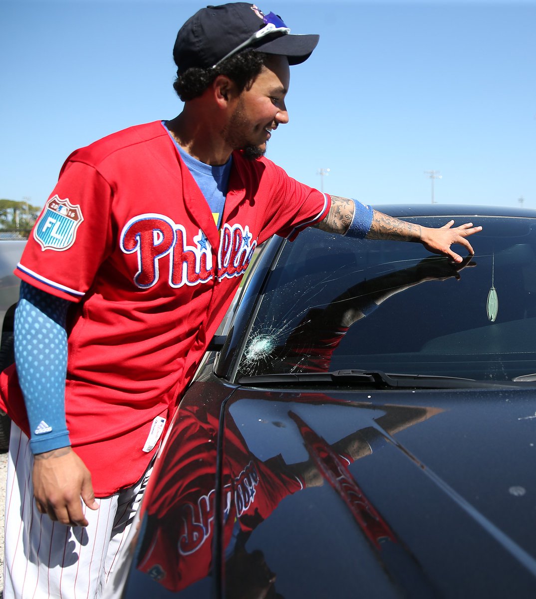 Freddy Galvis checks damage to window after Franco hit a ball out of the park during BP. #Phillies #springtraining pic.twitter.com/7Zq8qG0wFy