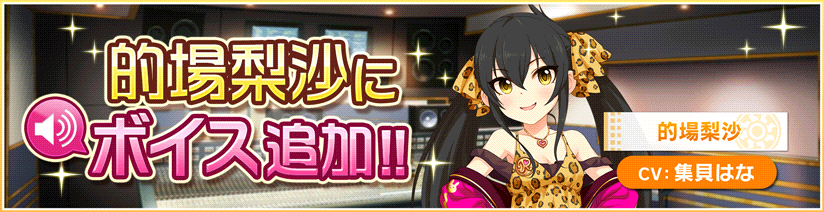 【的場梨沙ボイス追加のお知らせ】 以下のアイドルのセリフにボイスを追加しました。 <ボイスを追加したアイドル> 的場梨沙 CV:集貝はな ※一部ボイスにつきましては、後日追加予定となります。詳しくはゲーム内のお知らせをご確認ください。