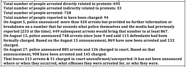 Based on the most recent police announcement containing exact figures (on Aug 27), the total number of protesters arrested is now 908 and the total number charged in court is 145. https://bit.ly/2M67fGu pic.twitter.com/lXMNnOLFVS