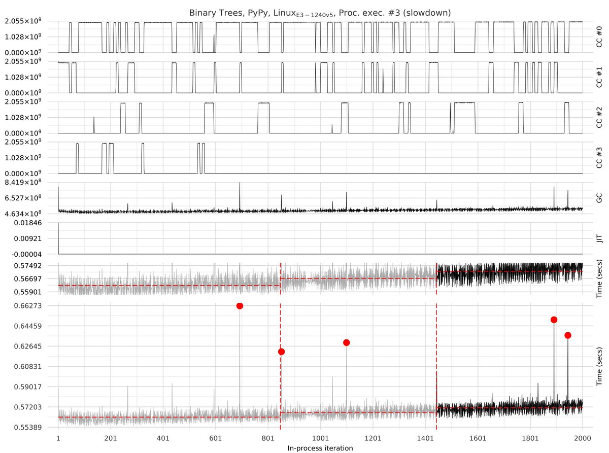 And just for fun, here's binary trees showing a potential problem in PyPy's GC. Note the upward ramp is correlated with the time spent in GC.pic.twitter.com/P8GJwcPUEp