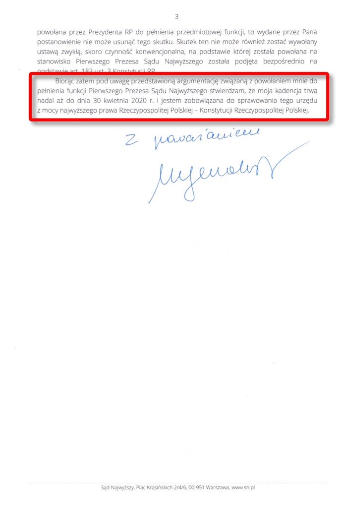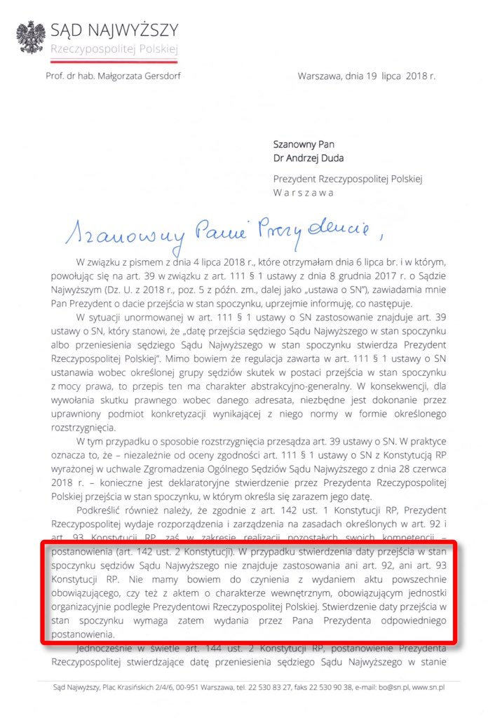 Prof. Gersdorf do Prezydenta Dudy: odesłanie sędziego SN w stan spoczynku wymaga postanowienia Prezydenta, z podpisem premiera. Zawiadomienie nie wystarczy. A Pierwszego Prezesa SN nawet tak się odesłać nie da. Jestem zobowiązana pełnić ten urząd do 30 kwietnia 2020:pic.twitter.com/SBaESPHEK0