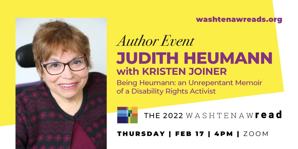 @judithheumann and@kristenjoiner for an online discussion of her memoir Being Heumann in the Washtenaw Reads Author Event–Thursday (Feb. 17) at 4pm on Zoom! More information here: https://aadl.org/node/582203 pic.twitter.com/JeJ17sAVvG