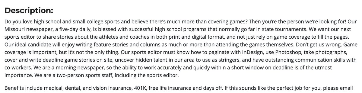 Setting aside the fact that this job posting for a sports editor of a newspaper in Missouri only pays up to $40k and doesn't even name the paper, it cites one of the company's benefits as "days off." Geez, things are bleak out there. https://www.journalismjobs.com/1659909-sports-editor-missouri-newspaper … pic.twitter.com/zGXZklUe9c