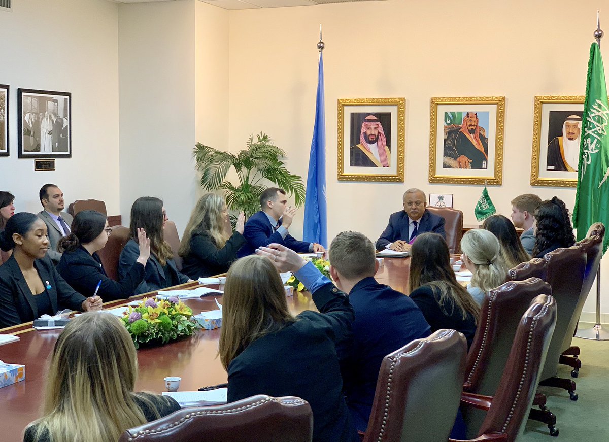 Ambassador @amouallimi welcomed students from @SyracuseU- Maxwell School Model #UnitedNations delegation, to learn more about the Kingdom of #SaudiArabia, and to view the #kingdom’s position on various issues, and it’s constructive cooperation with the @UNpic.twitter.com/4rp6Fib2uw