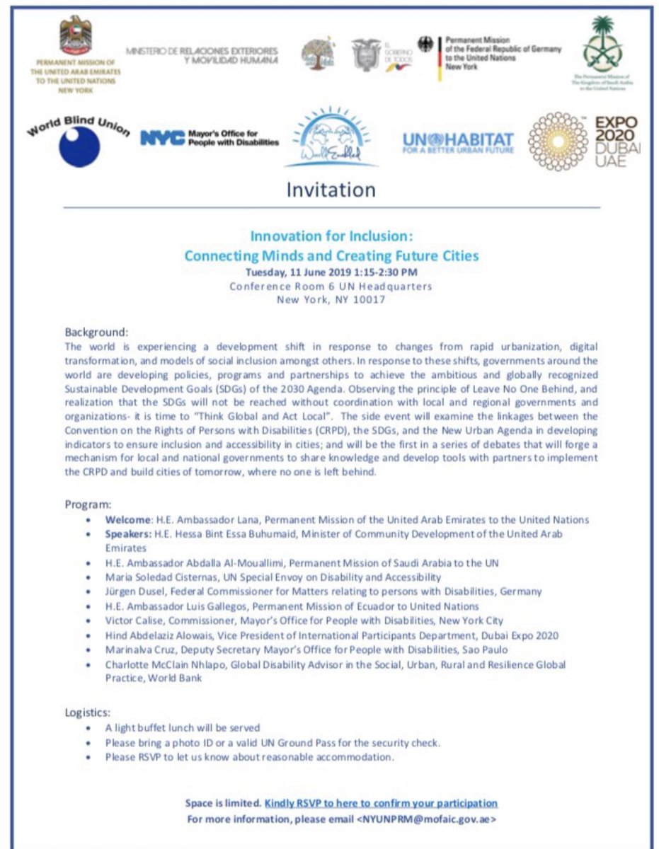 يدعوكم وفد #المملكةالعربيةالسعودية الدائم لدى #الأمم_المتحدة للمشاركة في الحدث الجانبي بعنوان " الابتكار من أجل الاستيعاب" الذي سينظم على هامش أعمال الدورة ١٢ لمؤتمر الدول الأطراف في اتفاقية حقوق الأشخاص ذوي الإعاقة، يوم غد الثلاثاء١١ يونيو من الساعة ١:١٥ وحتى ٢:٣٠، قاعة رقم ٦pic.twitter.com/QVUWpGh4ZS