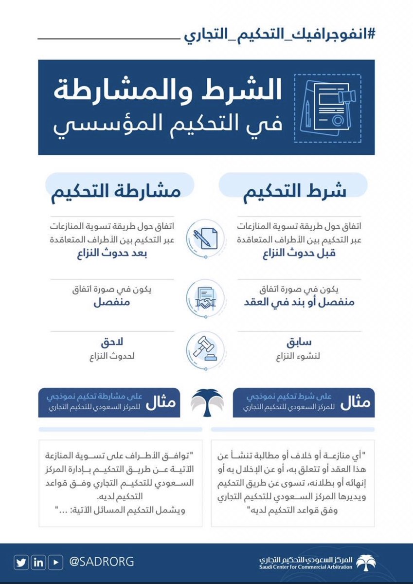 يستند نظام التحكيم السعودي إلى قانون الأونسيترال النموذجي للتحكيم التجاري الدولي، وقد أعطى للأطراف الخيار في اختيار القانون الواجب التطبيق والقواعد الحاكمة للنزاع ومكان ولغة التحكيم وأعضاء هيئة التحكيم، وأكسب الأحكام الصادرة حصانة لا تقبل الطعن فيها، عدا رفع دعوى ببطلان الحكمpic.twitter.com/7SIfQUq0tH