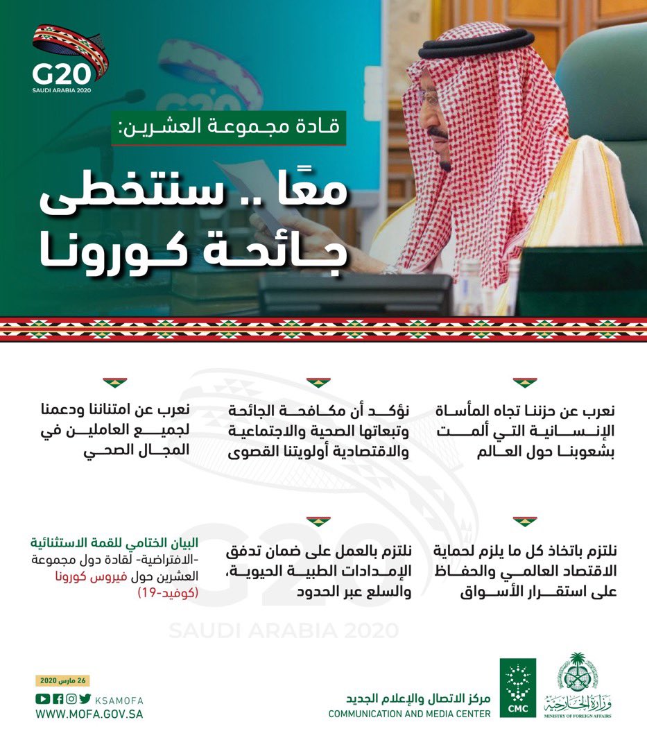 #المملكةالعربيةالسعودية على أن معالجة الوباء وآثاره الصحية والاجتماعية والاقتصادية هي أولوية مطلقة، وأن التعاون الوثيق والتنسيق الفعال هما السبيل الوحيد للخروج من هذه الأزمة أقوى مما قبل، وهذا ما أكدت عليه قمة قادة دول#مجموعةالعشرين الافتراضية برئاسة#خادم_الحرمين_الشريفينpic.twitter.com/SuofP0o6AX – at Permanent Mission of the Kingdom of Saudi Arabia to the United Nations