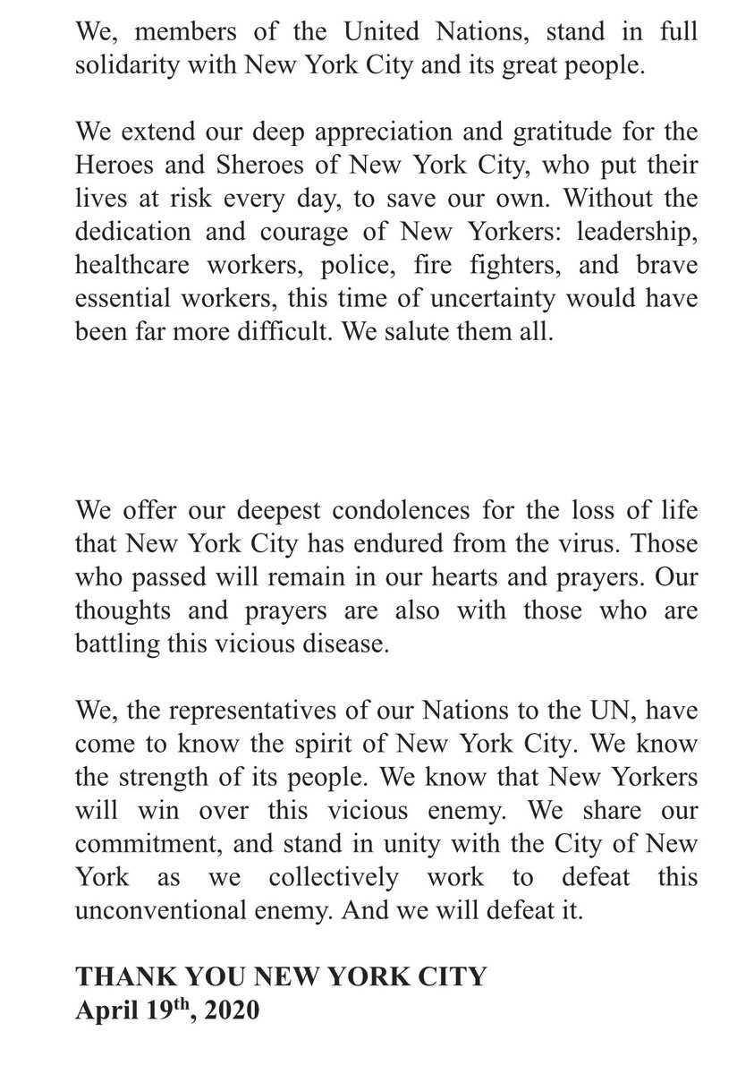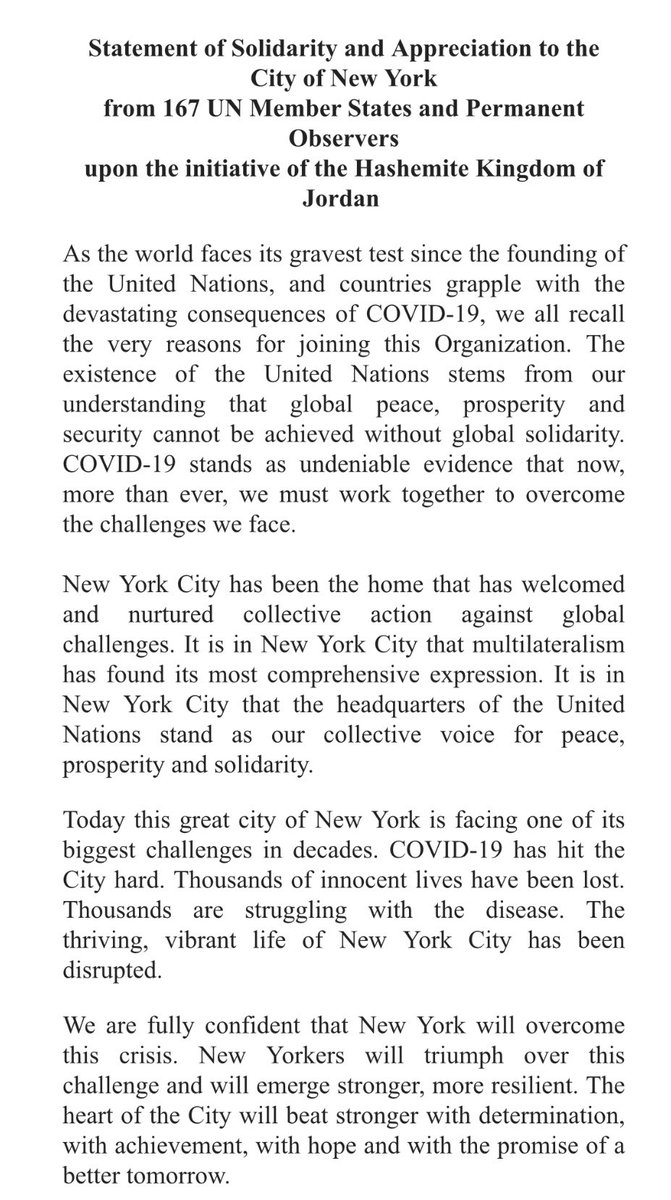 انضم وفد #المملكةالعربيةالسعودية الدائم لدى الأمم المتحدة، لبيان وفد #المملكةالأردنيةالهاشمية الشقيقة، للتضامن العالمي مع مدينة #نيويورك في إطار التعاون الدولي لمكافحة جائحة #كوفيد١٩، معبرين عن السلام والتقدير للمدينة التي تحتضن مقر #الأمم_المتحدة