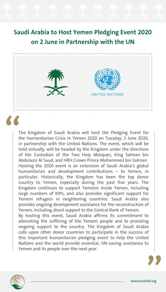 Based on #SaudiArabia's efforts to alleviating the suffering of the #Yemeni people, #KSA will host the virtual #PledgingEvent for the Humanitarian Crisis in #Yemen 2020 on the 2nd of June,and calls upon donor countries to participate in this important humanitarian pledging eventpic.twitter.com/YGn2juiEgn