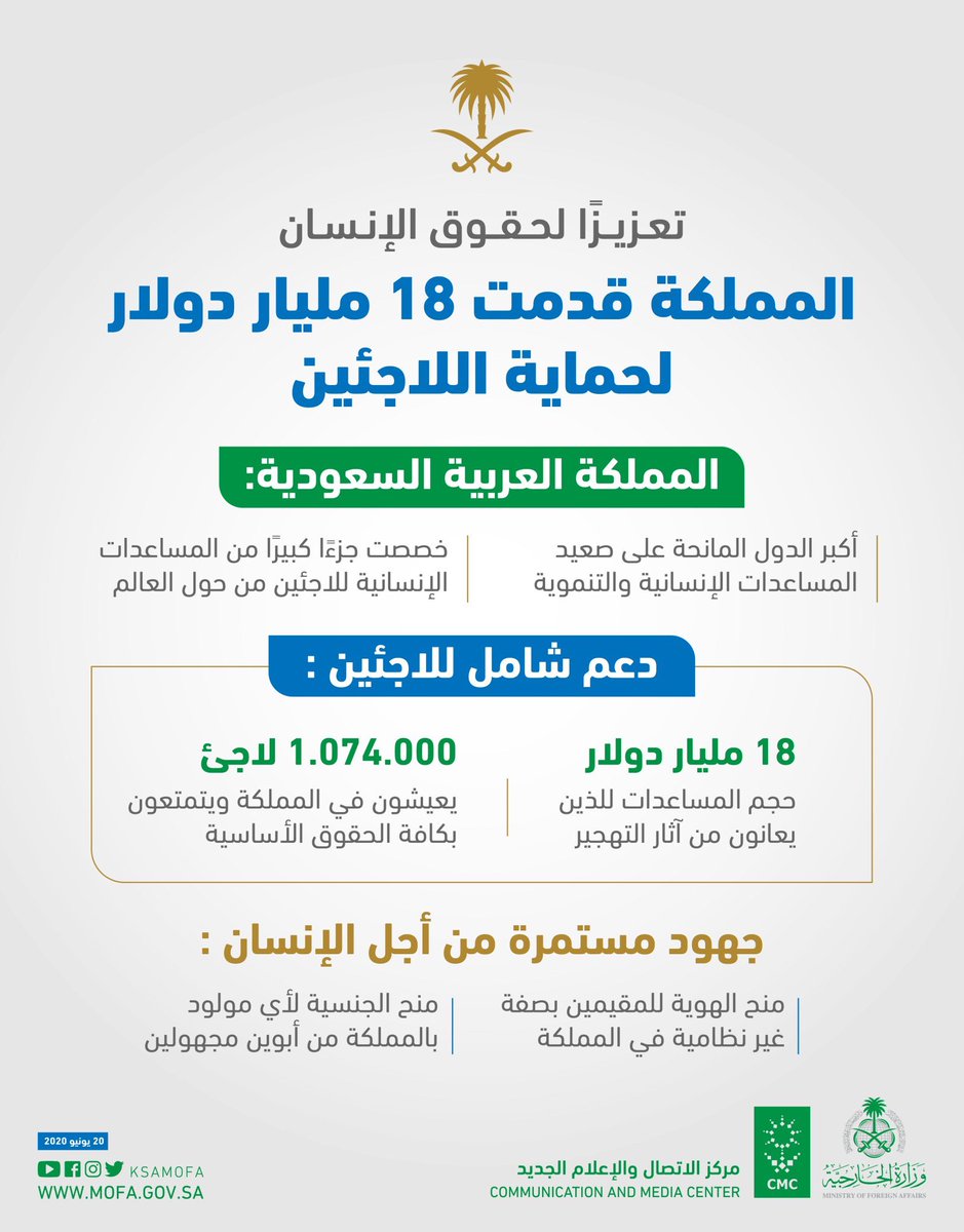#المملكةالعربيةالسعودية هي من الدول الرائدة في دعم #اللاجئين حول العالم وقدمت ١٨ مليار دولار لحمايتهم ومساعدتهم