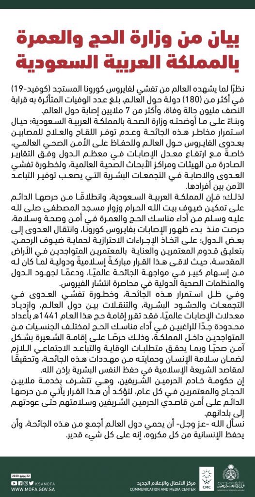 نص البيان الصادر عن وزارة الحج والعمرة بشأن إقامة #الحج هذا العامpic.twitter.com/wM6M28UnjP