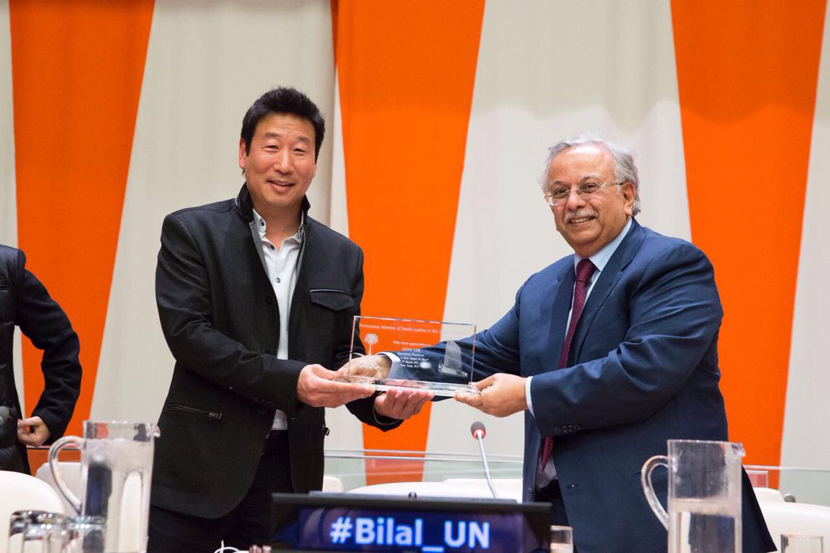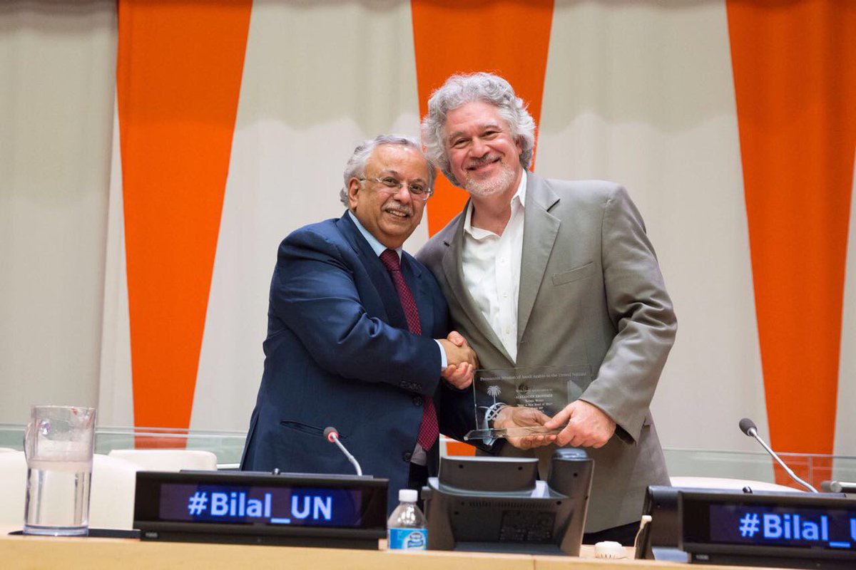 Ambassador Al-Mouallimi presents the awards to @atjamal & his team at the end of #Bilal_UN screening at #ECOSOC last nightpic.twitter.com/odJqCVc94K