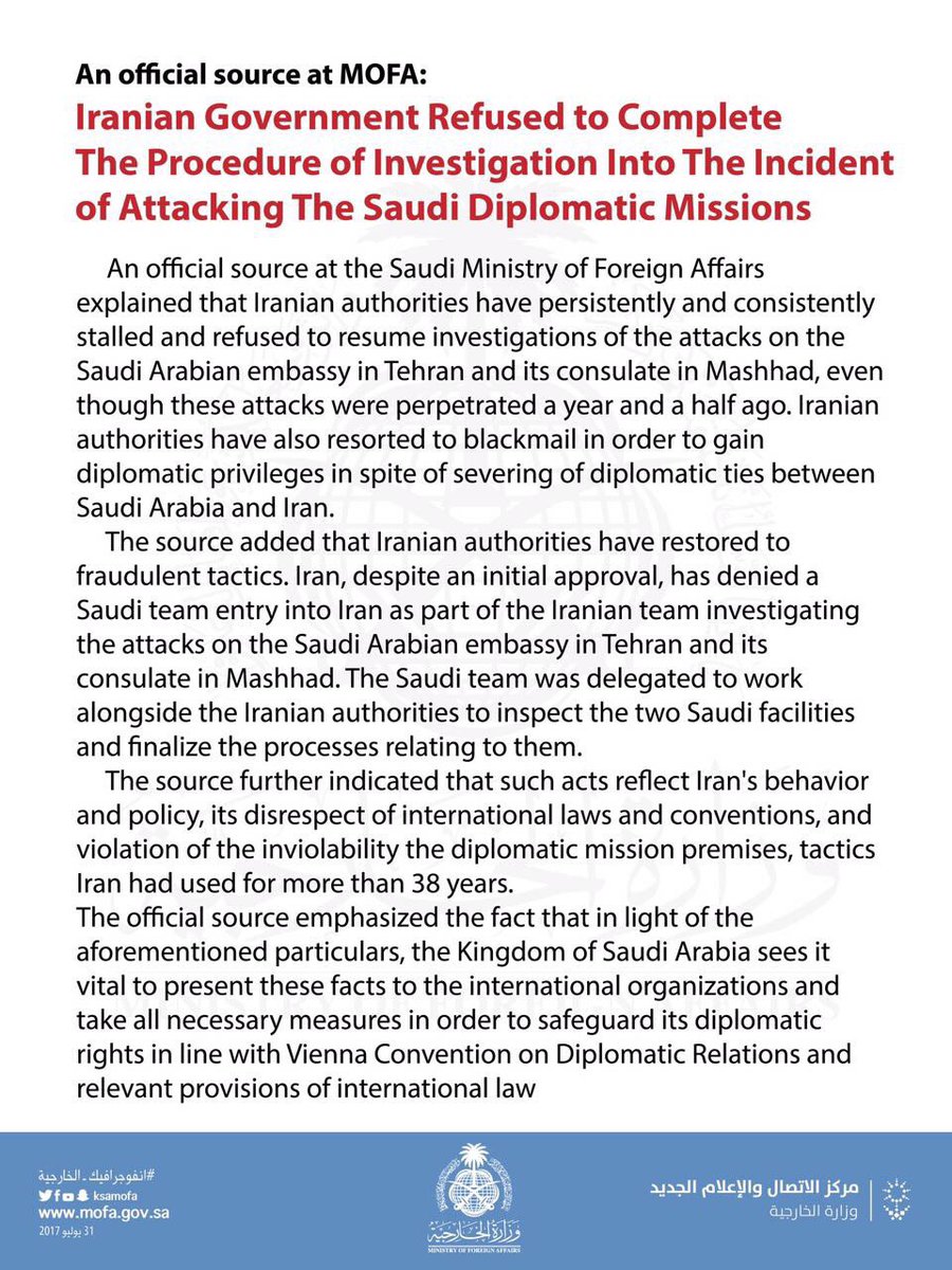 #Iran refused to complete the procedure of investigation into the incident of attacking the Saudi diplomatic missions..pic.twitter.com/1XOASaPRrp