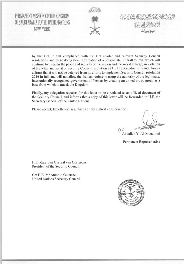 The Permanent Mission of Saudi Arabia to the UN issued a letter to the United Nations Security Council #UNSC concerning the seven ballistic missiles launched by the #Houthi rebels targeting four cities in densely-populated civilian areas in #SaudiArabiapic.twitter.com/6I46FhqHIG