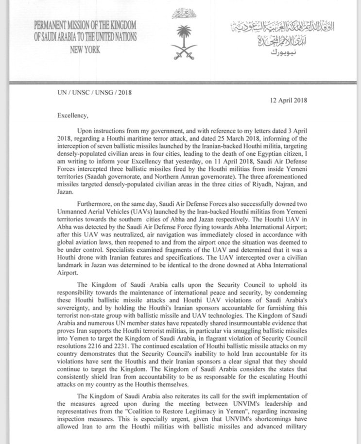 The Permanent Mission of Saudi Arabia to the UN issued a letter to #UNSC concerning the latest #Houthi terrorist attack on Saudi Arabia:pic.twitter.com/ohbKGNVNpL