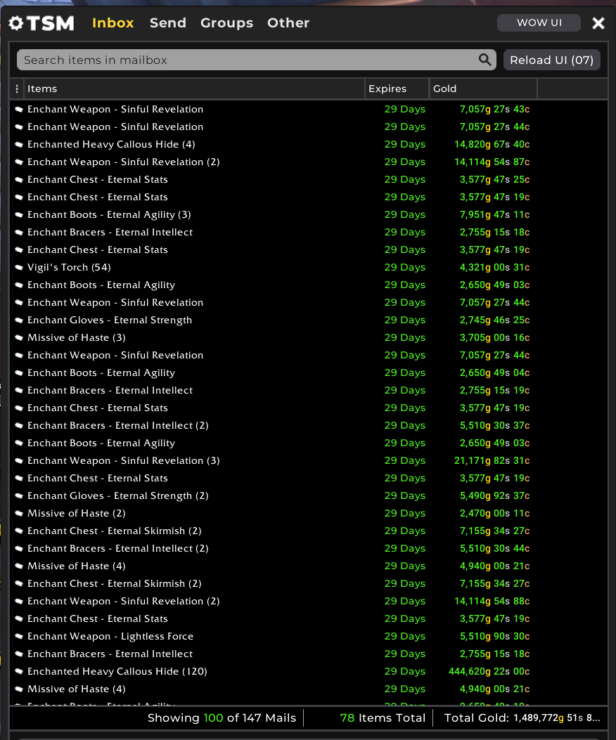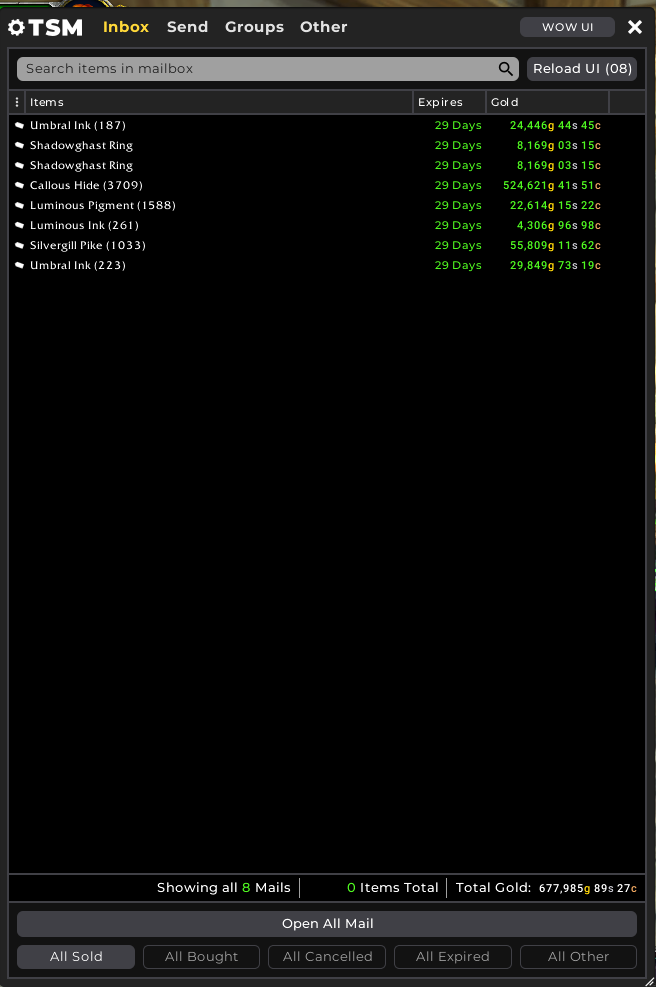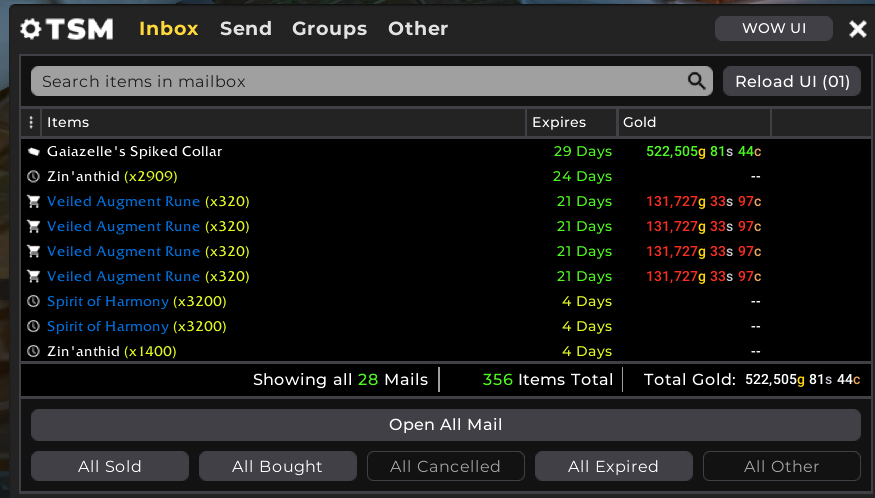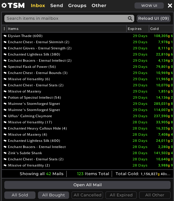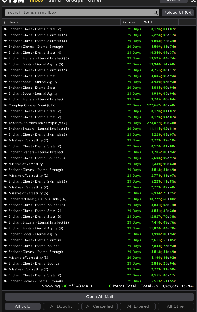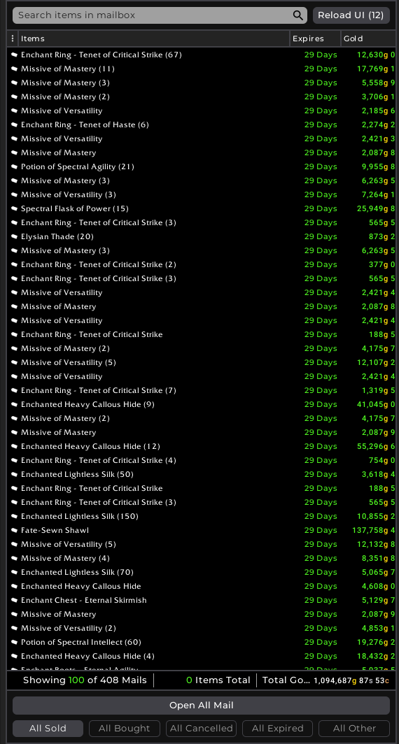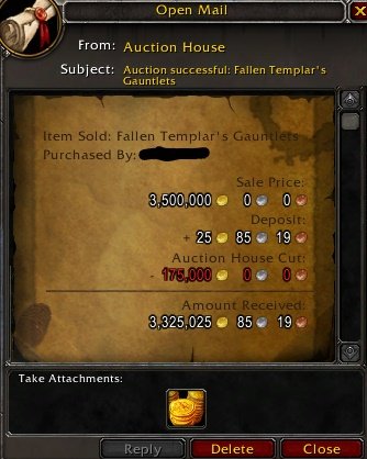 Crazy Sunday mailbox more than 12 million gold, this is my personal record for 1 day sales. it cost me 7 million gold to reset markets and 4.5 hours of intensive AH pvp and still have ton of matts to use on raid day basically free