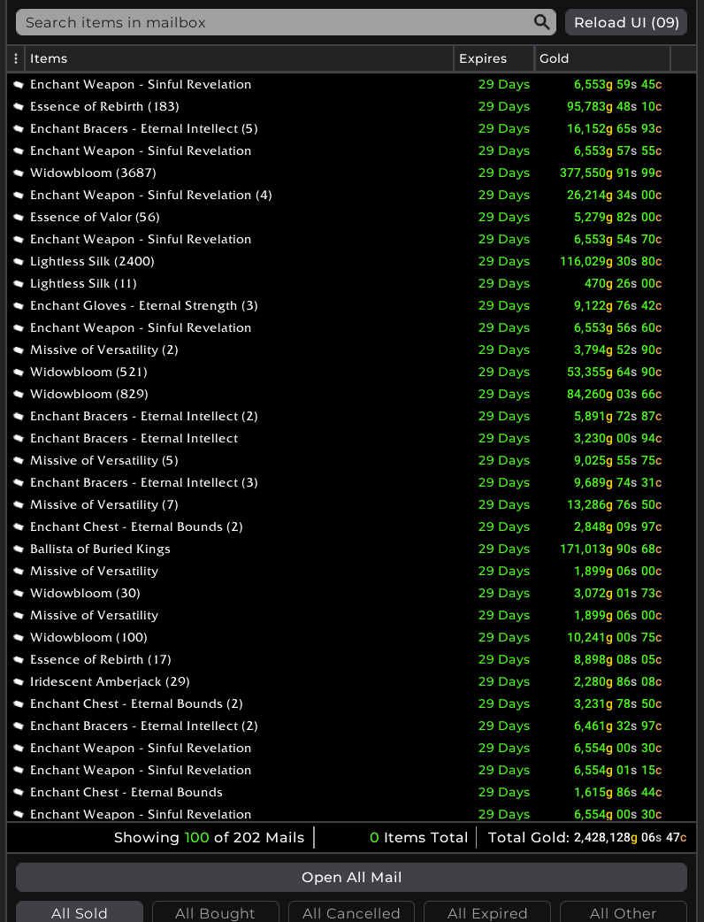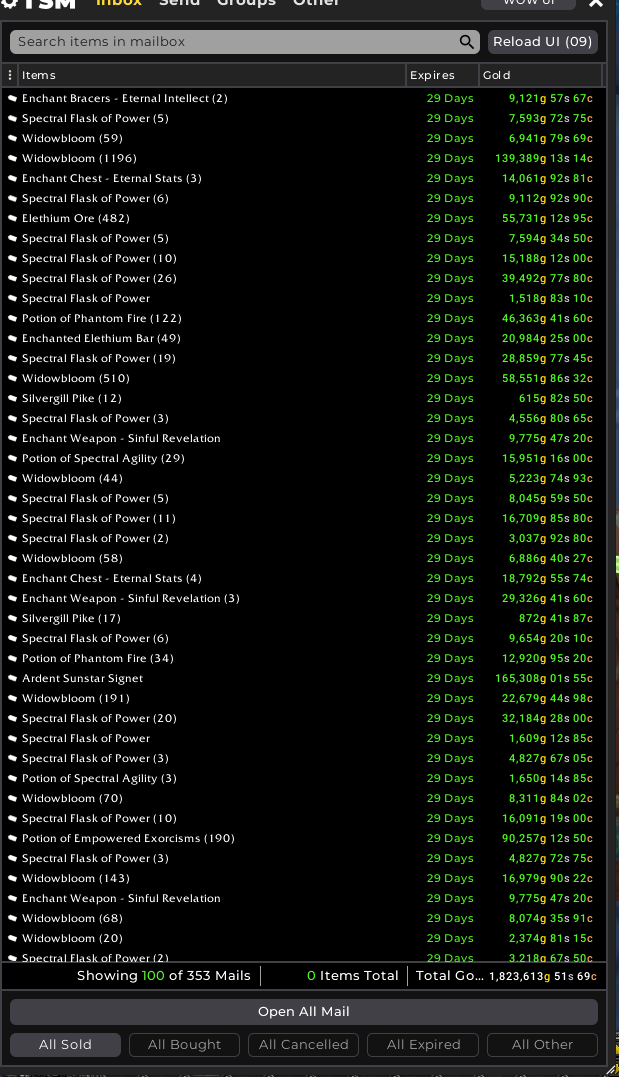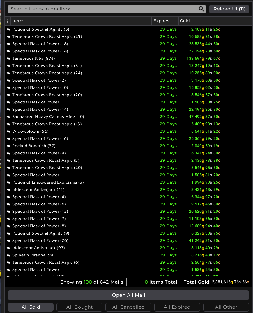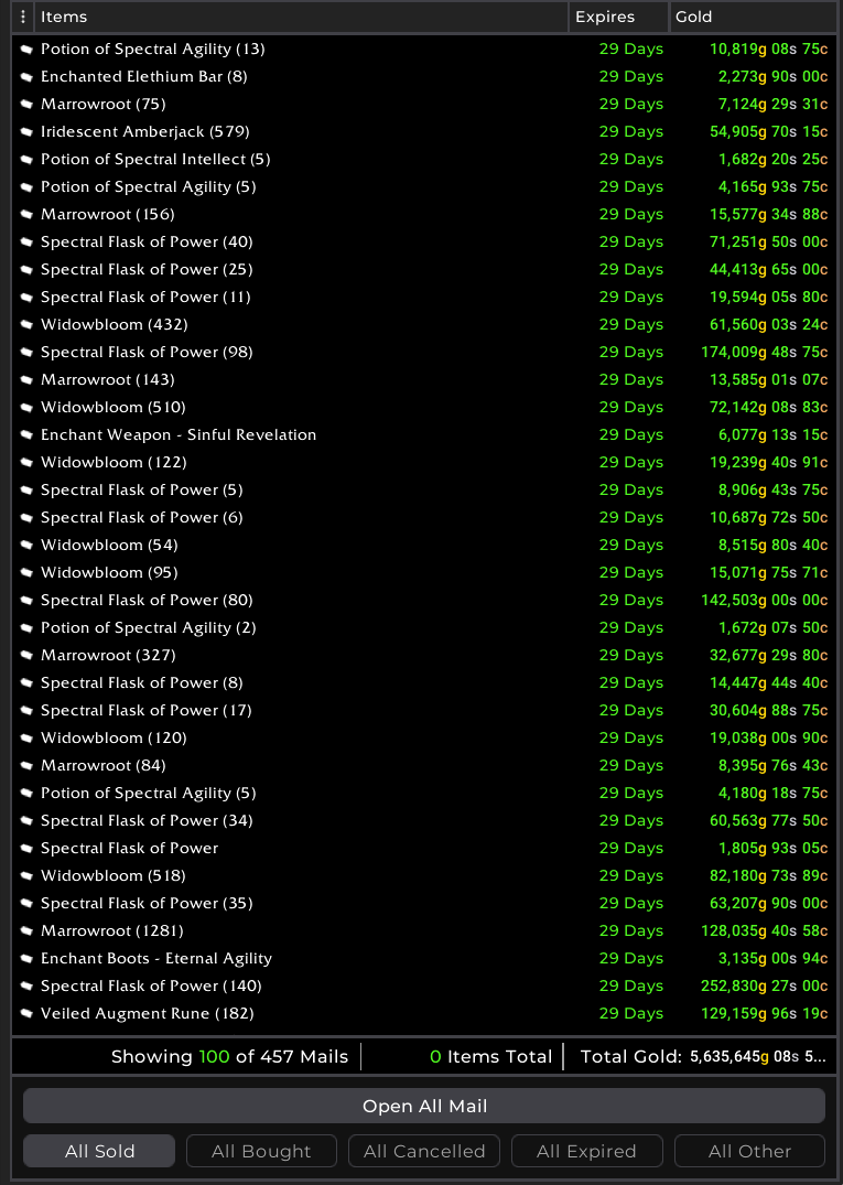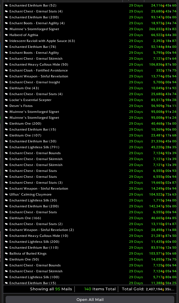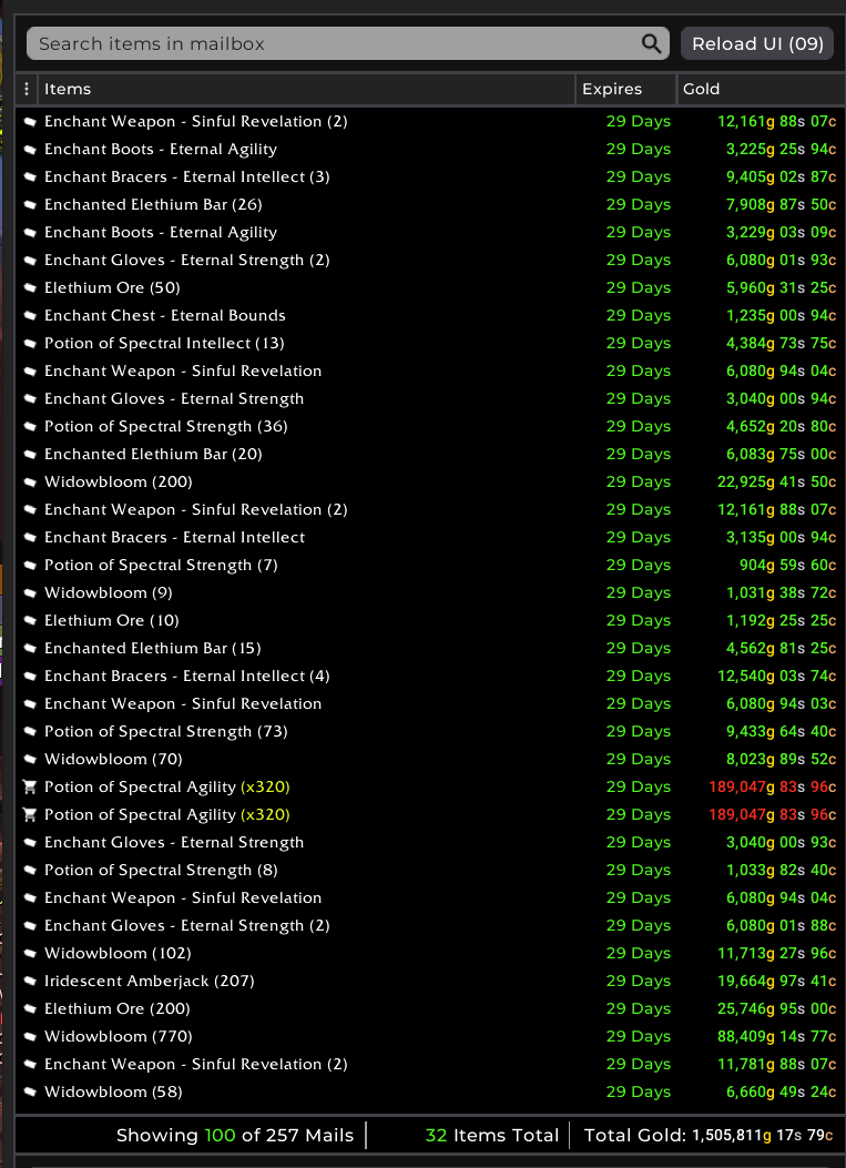 Thursday mailbox more than 6000k, I tried alchemy and it worked but heavy AH PVP. so hectic