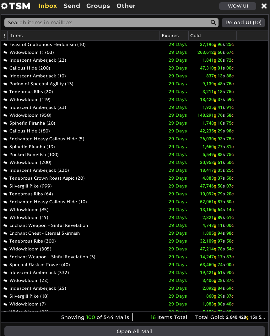 Mailbox for the past 3 days almost 6600k. TIP for tomorrow....if you are alchemist your rare herb is widowbloom not nightshade