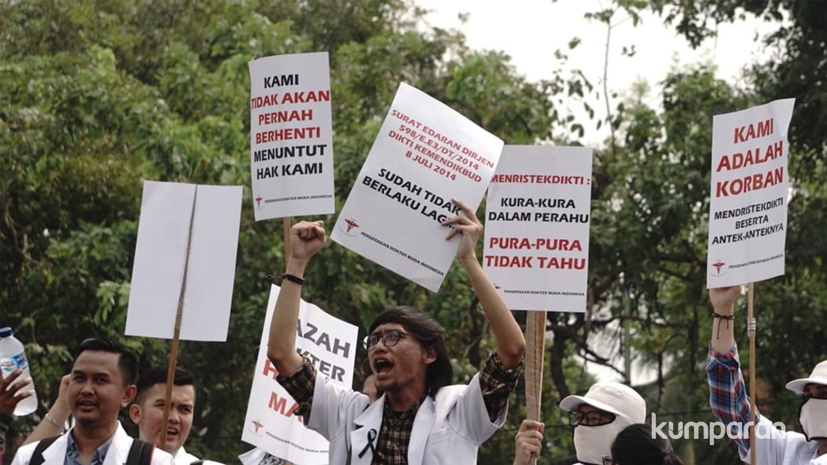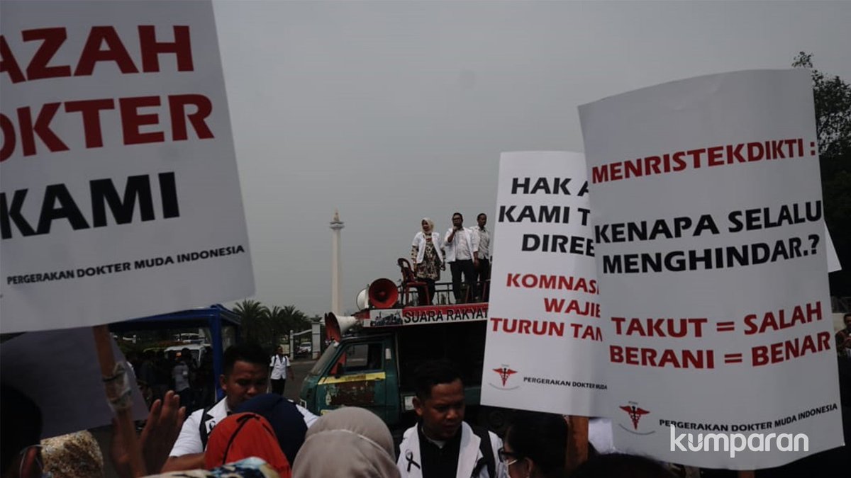 Pergerakan Dokter Muda Indonesia menggelar aksi di depan Istana Merdeka, Jakarta. Mereka menuntut permasalahan ijazah dokter.