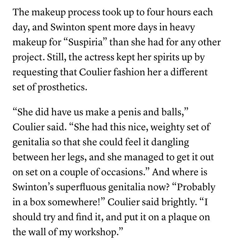 Tilda Swinton plays an 82-year-old man in SUSPIRIA, composed his IMDb bio herself, and also did... this https://www.nytimes.com/2018/10/10/movies/tilda-swinton-suspiria.html …pic.twitter.com/x18o5R44uC