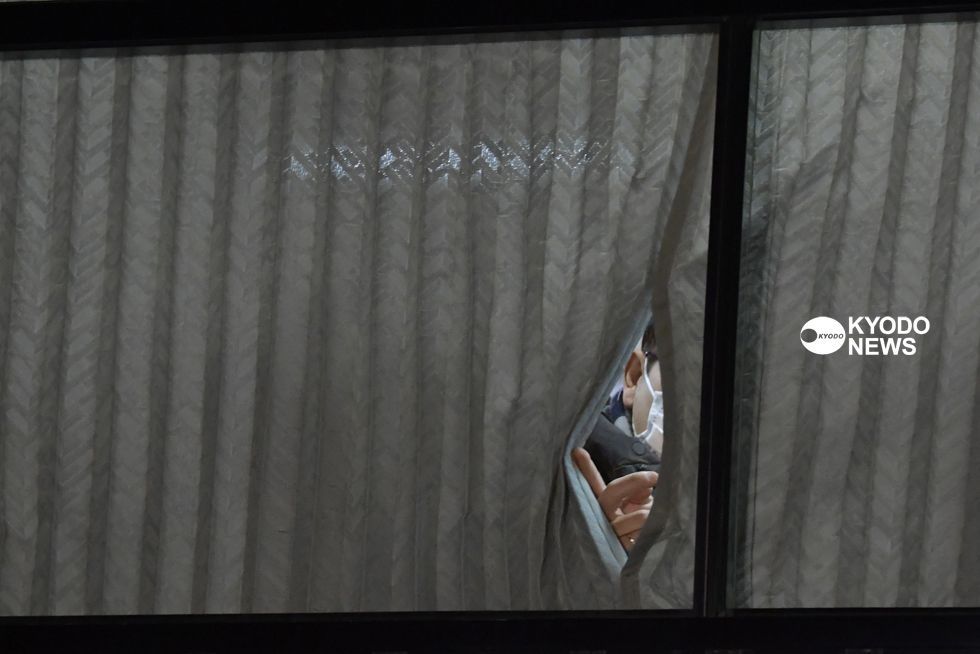 #国立保健医療科学院 に到着したバス。カーテン越しに外の様子をうかがう人の姿もありました(撮影・大島千佳)→https://buff.ly/2GGQjCk#武漢#新型コロナウイルスpic.twitter.com/Qxe42QG6CI