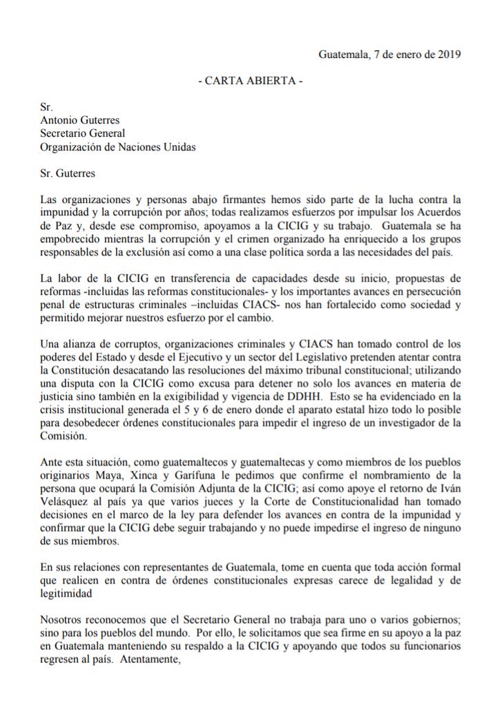 Varias organizaciones de la sociedad civil han enviado una carta abierta al secretario general de las Naciones Unidas, António Guterres, pidiéndole que sea firme y mantenga su apoyo hacia la CICIG.pic.twitter.com/StBUPrlVKz