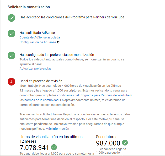Hola de nuevo, entendemos tu situación y lamentamos que continúes esperando. Desafortunadamente, nuestro equipo no maneja tiempo específico para la revisión de canales. Agradecemos tu comprensión y paciencia durante el proceso.