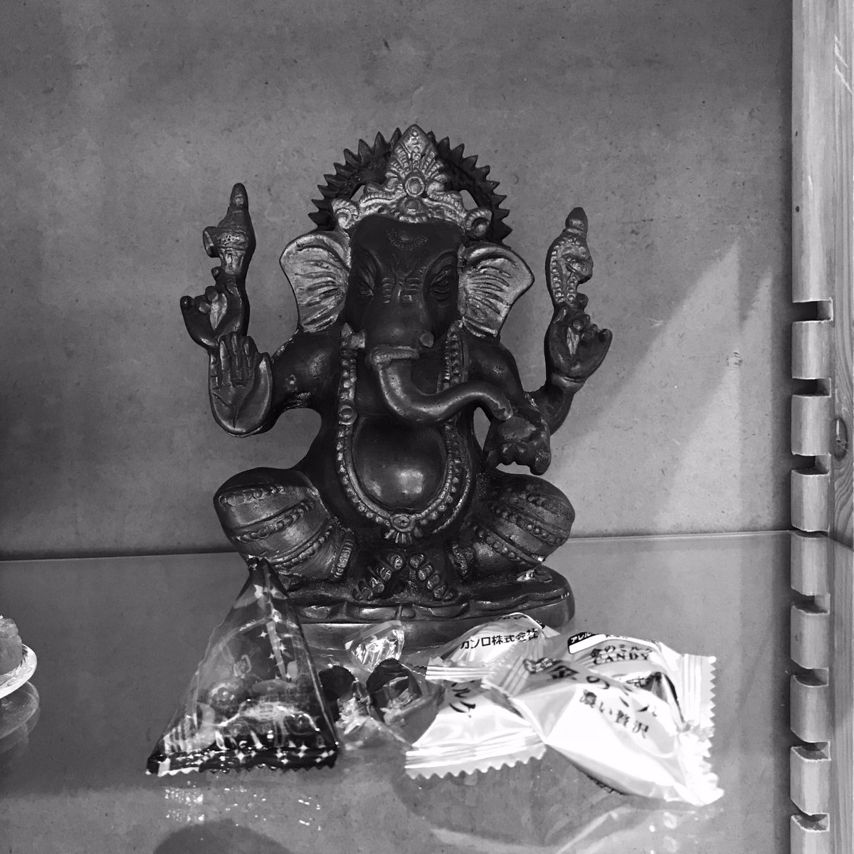 お客様に『ガネーシャさんは甘いものが好きやけんあげときー』と言われ飴をおいていかれたらしい。