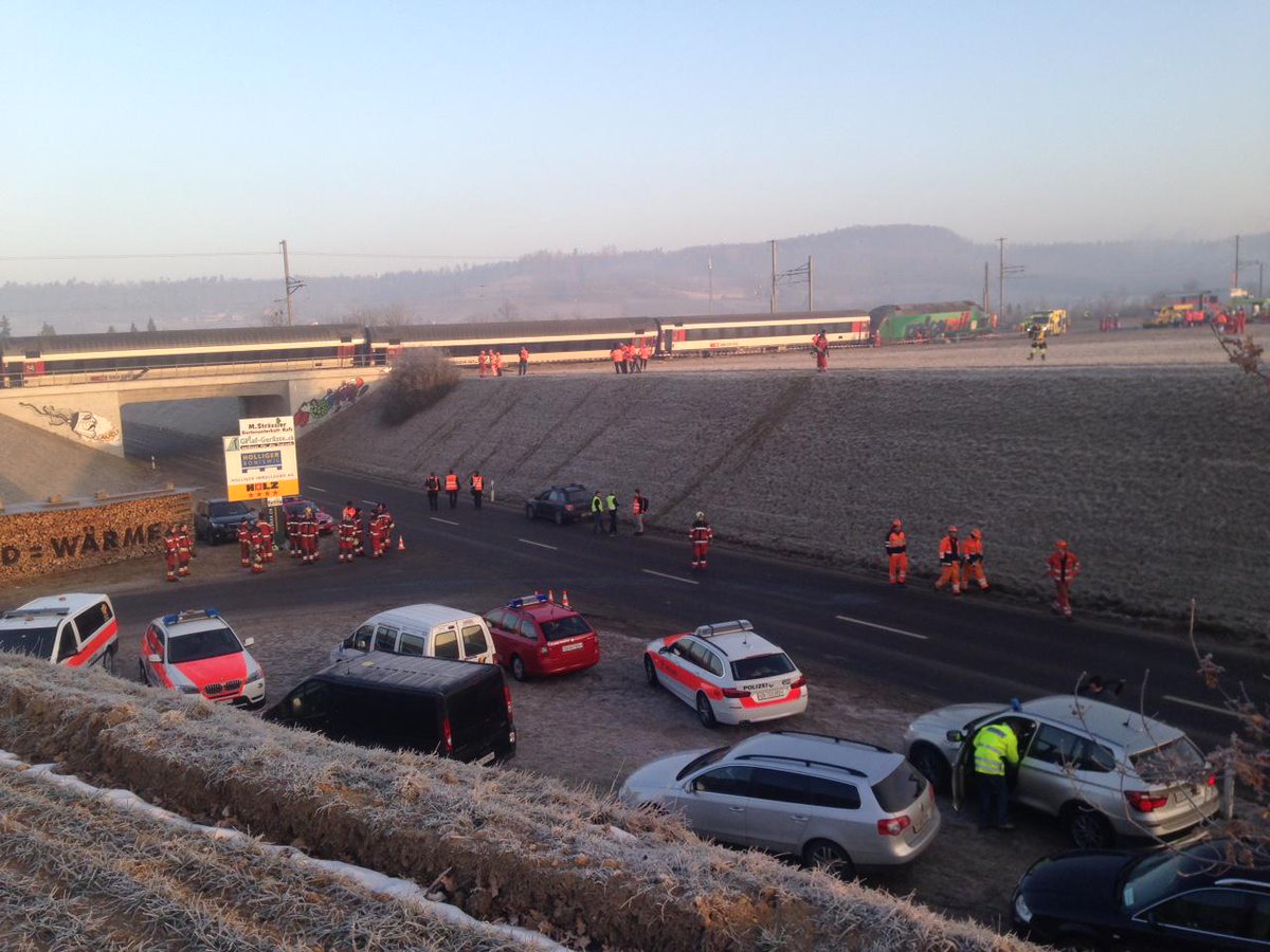 #Rafz Ein Intercitiy ist offenbar auf eine S-Bahn aufgefahren. Einige Waggons des Intercitys kippten in der Folge.pic.twitter.com/KhVoEKykxm