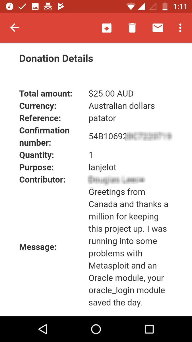 Just received my first donation for https://GitHub.com/lanjelot/patator … from a generous Canadian. Great feeling. Thanks buddy!pic.twitter.com/jdsWF4Bgif