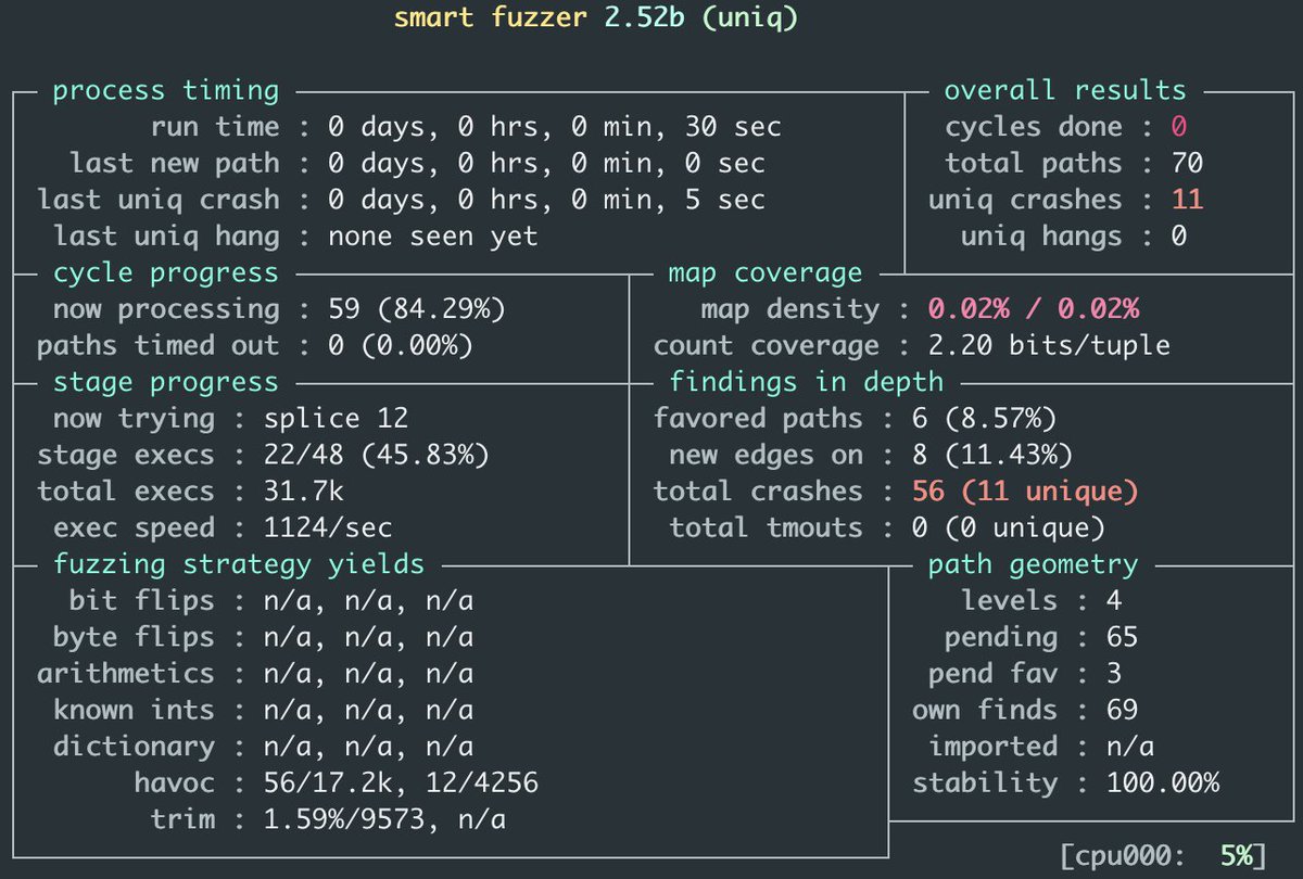 The screenshot shows in 25-30 seconds it can find 56 crashes in uniq from LAVA-M